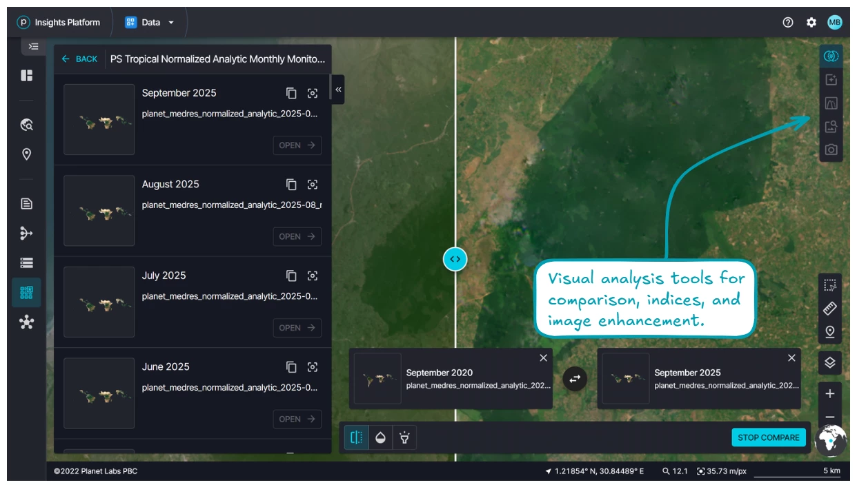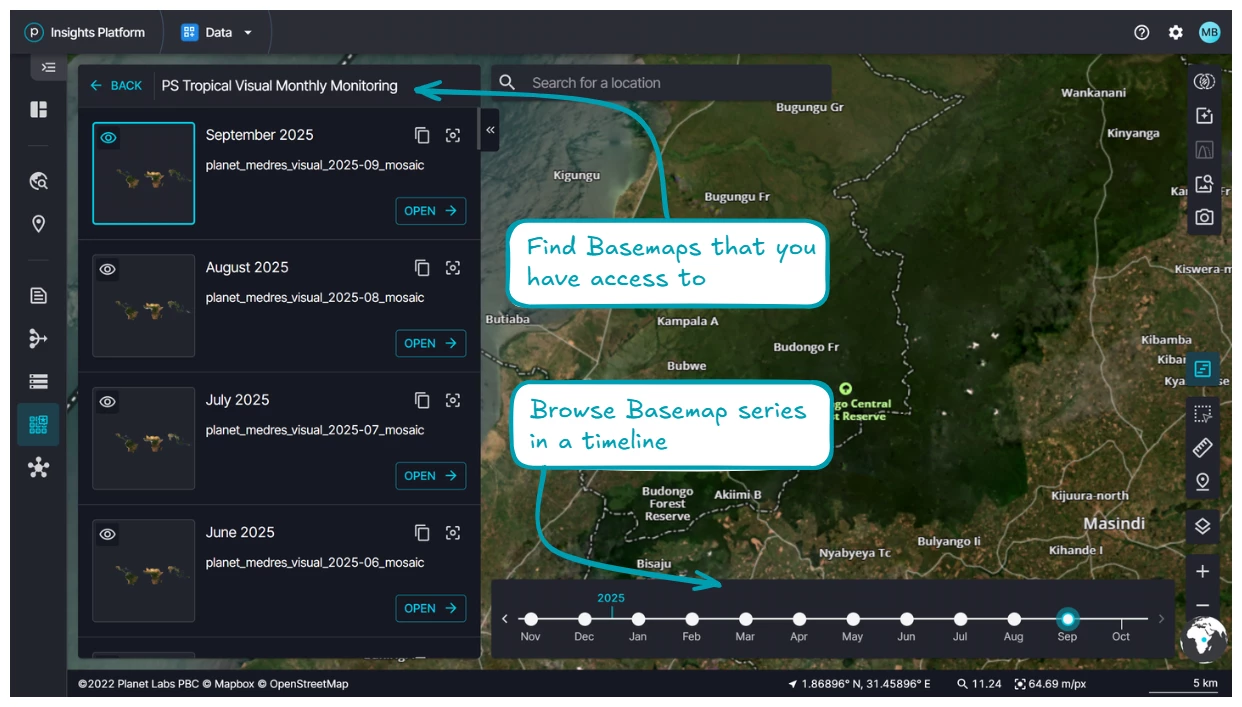 If you have access to Planet Basemaps products, head over to the new experience to test it out: insights.planet.com/data/mosaics. We ask that you migrate your workflows to this new application before January 31st, 2026. At that time, Planet will sunset the legacy tools available in Basemaps Viewer.