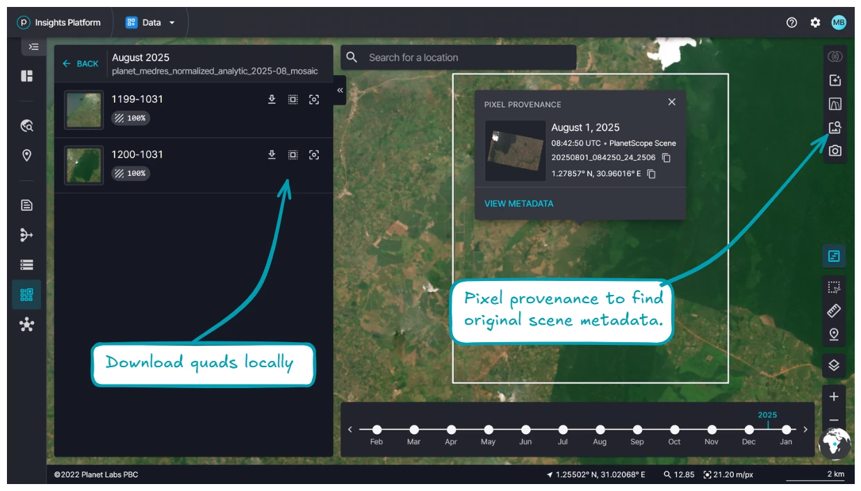If you need to work locally with the Basemap, you can find and download quads within an area of interest that you draw on the map. And if you need access to the metadata for the source imagery that comprises the basemap, you can find this information through the pixel provenance tool.