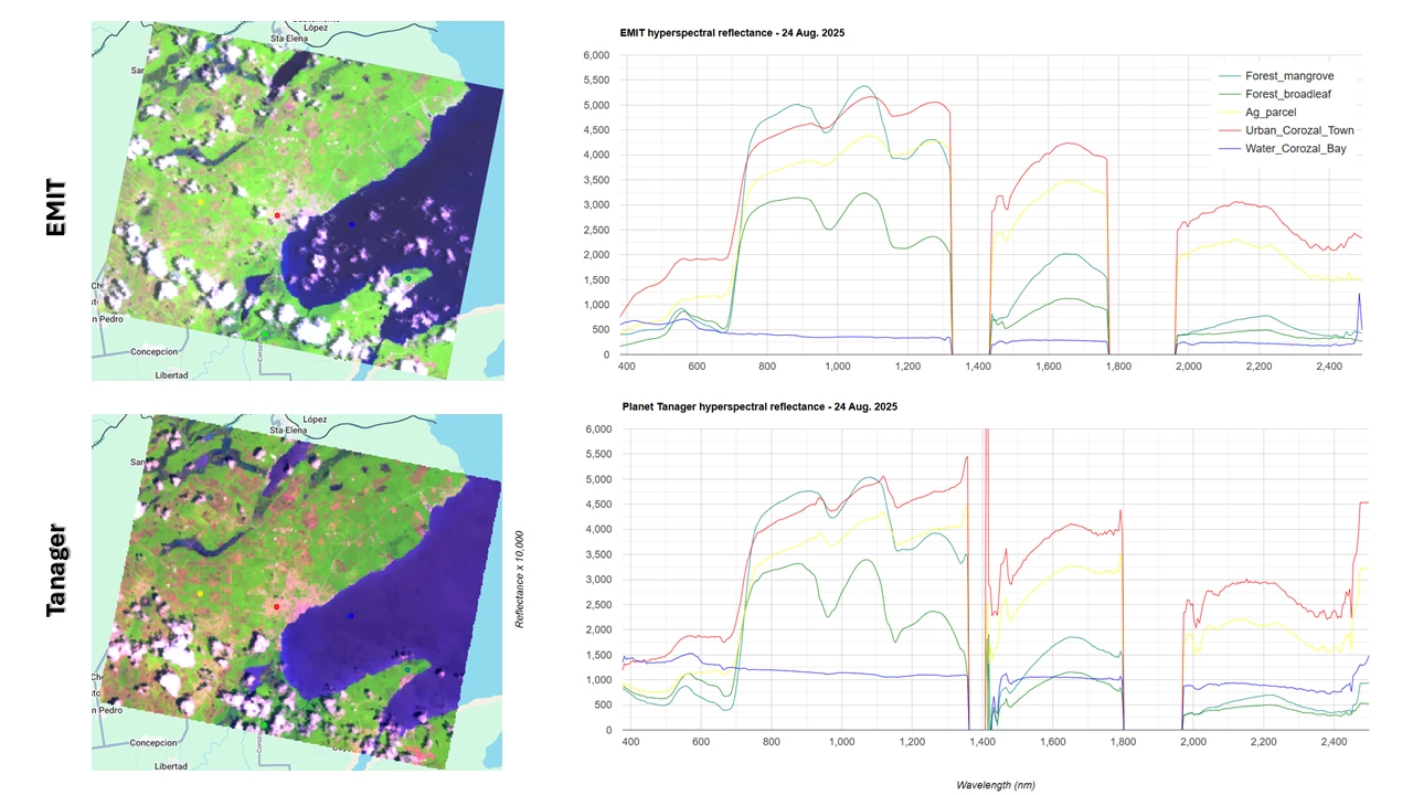 Here’s a preview of coming attractions of what I’ve started working on for the competition. Both scenes (EMIT and Tanager) are from the same day (24 Aug. 2025). I uploaded some sample Tanager data to GEE, where it can sit alongside EMIT, Hyperion, and PACE. I’m hoping that Sam Roy might also decide to upload the other Tanager open data to his Community GEE Catalog (https://gee-community-catalog.org/projects/tanager/).